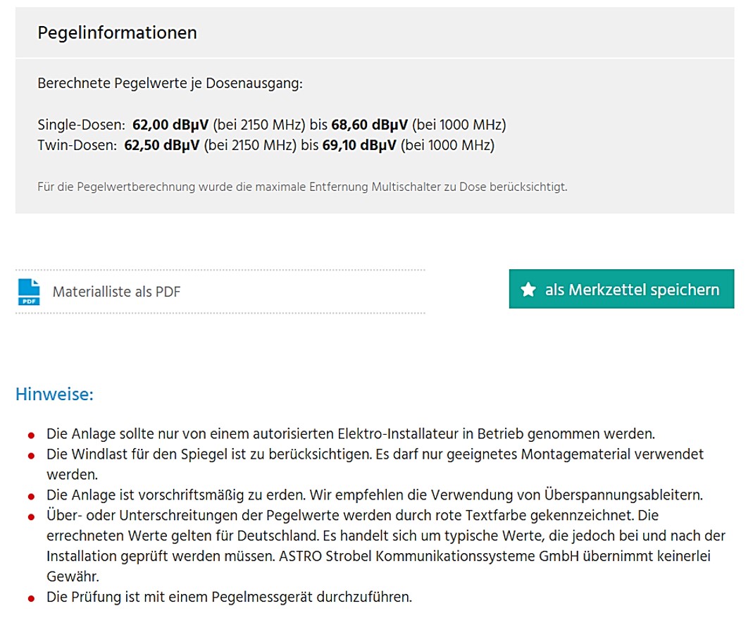 Unsere Techniker sind sich einig: "Einfachstes Tool, um mal eben eine kleine SAT Anlage zu planen". Heute muss es schnell und einfach gehen. Über den ASTRO SAT Konfigurator lassen sich kleine SAT Anlagen für bis zu 16 Teilnehmer ganz einfach planen. Mit sieben einfachen Fragen wird der Nutzer durch das System geführt und erhält am Ende alles was er für seine SAT Anlage braucht. Eine Auflistung des Materials mit Online-Verlinkung für weitere Detailinfos, Pegelwerte, eine Einkaufsliste als PDF, Merkzettel-Funktionalitäten und Tipps bzw. Hinweise für die professionelle Installation durch einen Fachmann. Während des Planungsvorgangs werden Fehler mit Hinweisen ausgeschlossen. So kann auch mobil über das Smartphone bequem geplant werden.
